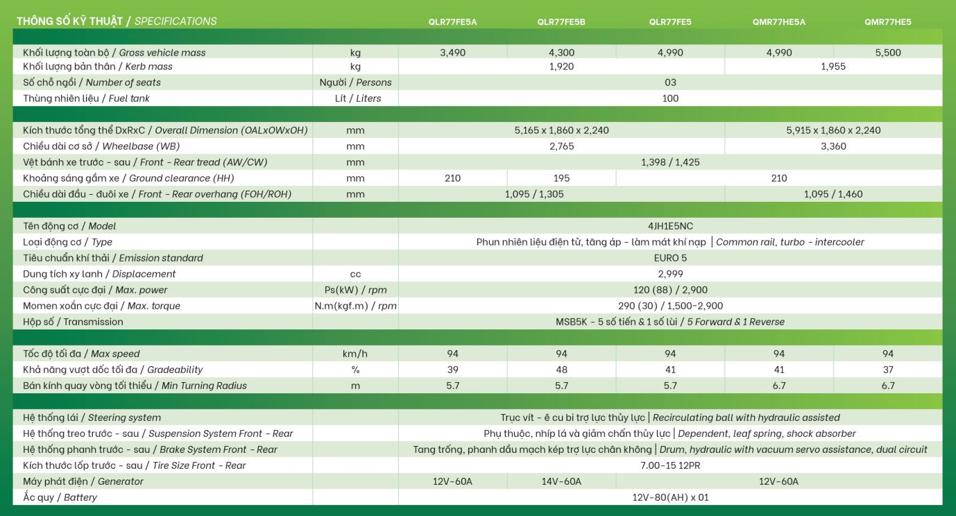 - Kích thước lốp trước – sau 7.00-15 12PR
